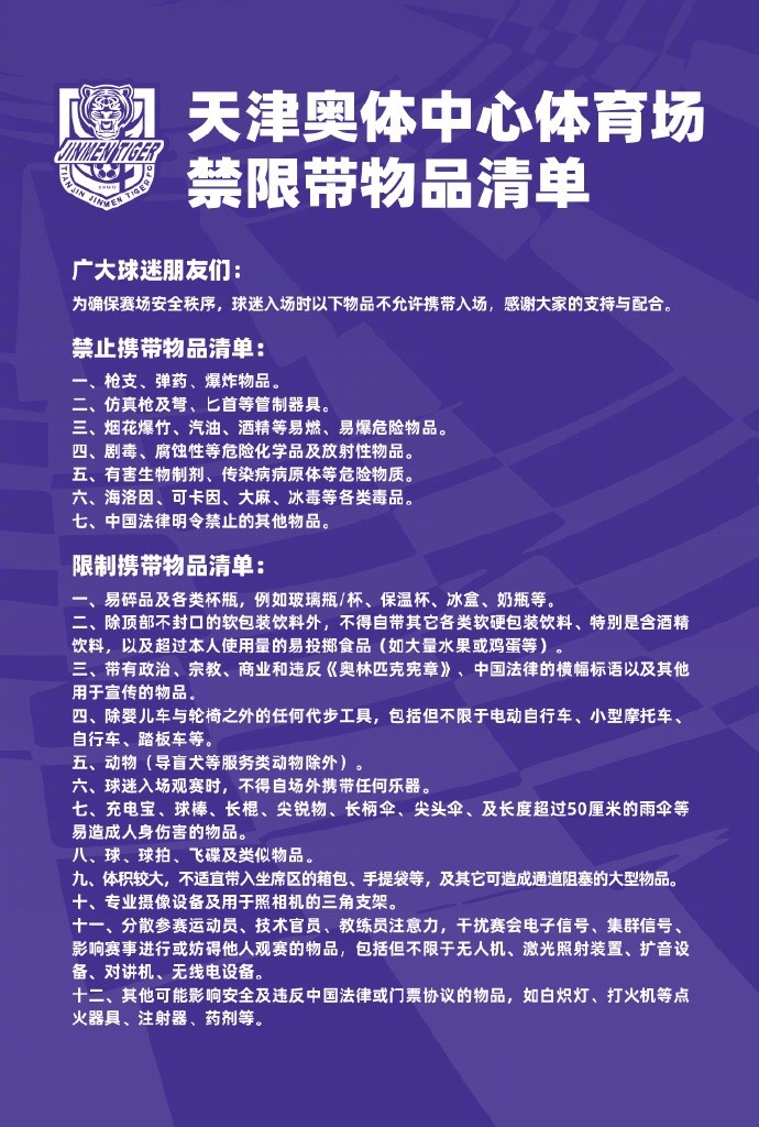 亲爱的球迷一又友们:为确保赛场安全顺次,球迷入场时以下物品不允许捎带入场,感谢全球的赈济与协作。