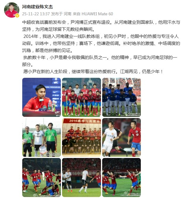 得知尹鸿博退役的音尘,原河南建业助理教授陈文杰发文谈到与尹鸿博合营的资格,并对他抒发钦佩以及奉上祝愿。