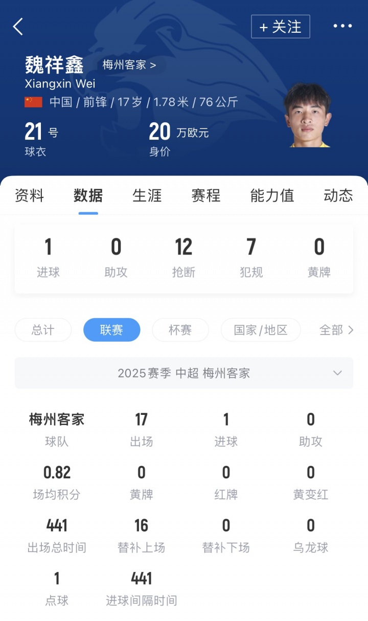 2025年是魏祥鑫管事生计的碎裂之年。3月,他在未满17岁时即完成中超首秀;4月客场对阵浙江队的比赛中,他罚入我方创造的点球,以17岁零42天成为中超历史上第四年青的进球者,亦然2008年级段首位在中超破门的球员。本赛季,他共代表球队出战17场中超联赛,慢慢成长为球队的中枢轮流球员。