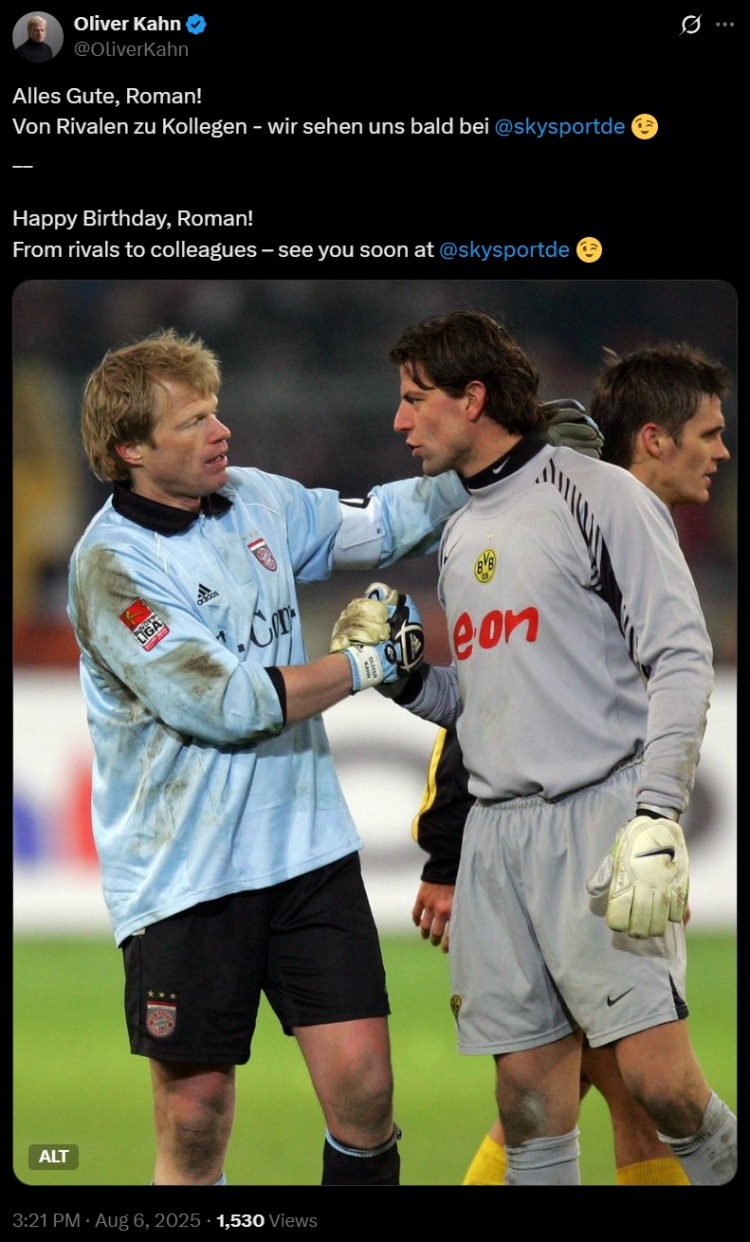 8月6日讯 出身于1980年8月6日的德国门将罗曼-魏登费勒本日迎来45岁诞辰,前东家多特以及前拜仁门将卡恩为其奉上诞辰祝愿。