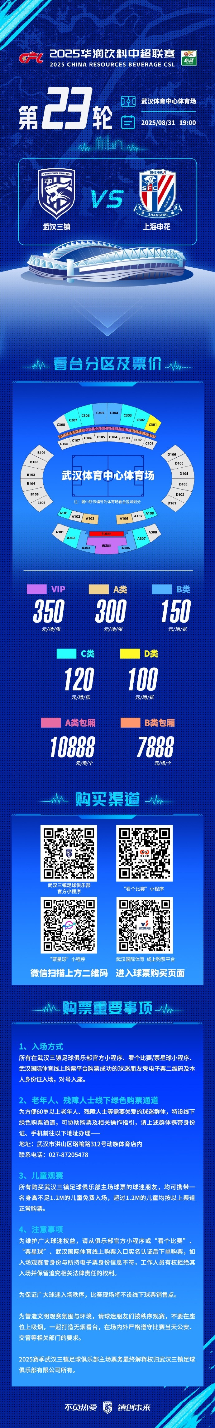 8月31日,2025华润饮料中超联赛第23轮,武汉三镇将转头主场迎战上海申花。本场比赛球票现已开启发售,接待诸君球迷一又友进行购买,你们的每一声高歌与饱读舞,齐将成为三镇将士前进的力量,让你我赓续并肩而战吧!