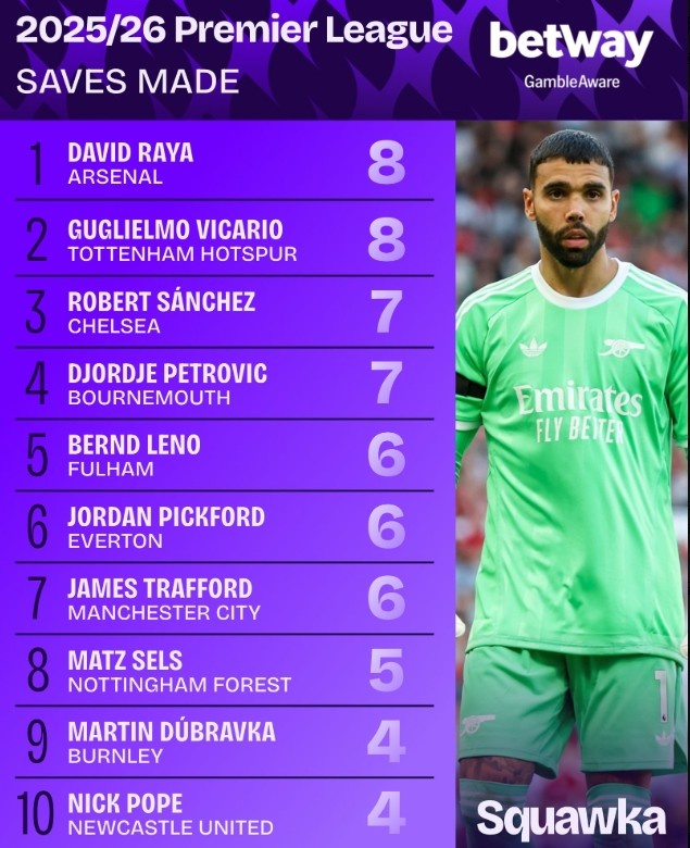 8月28日讯 本赛季英超照旧进行两轮比赛,阿森纳的拉亚和热刺的维卡里奥以8次比肩扑救榜榜首,并且两东说念主把守的球门迄今适度还未丢球。
