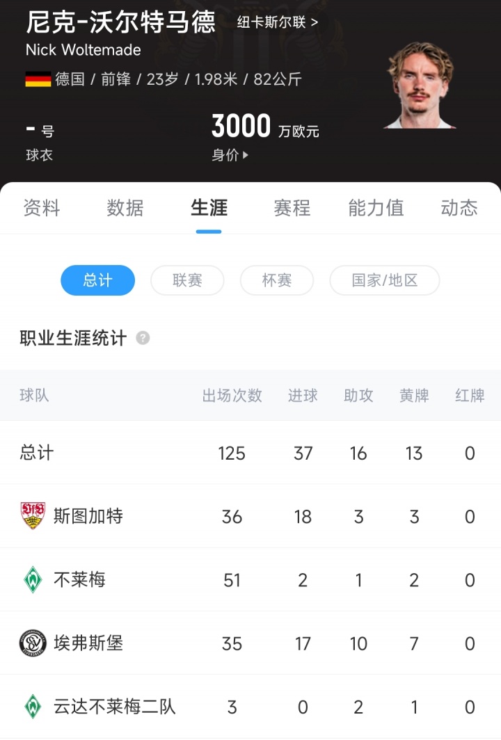 08月30日讯 官方音书,纽卡斯尔从斯图加特签下23岁的沃尔特马德,德转数据清晰,沃尔特马德的转会费为8500万欧元。