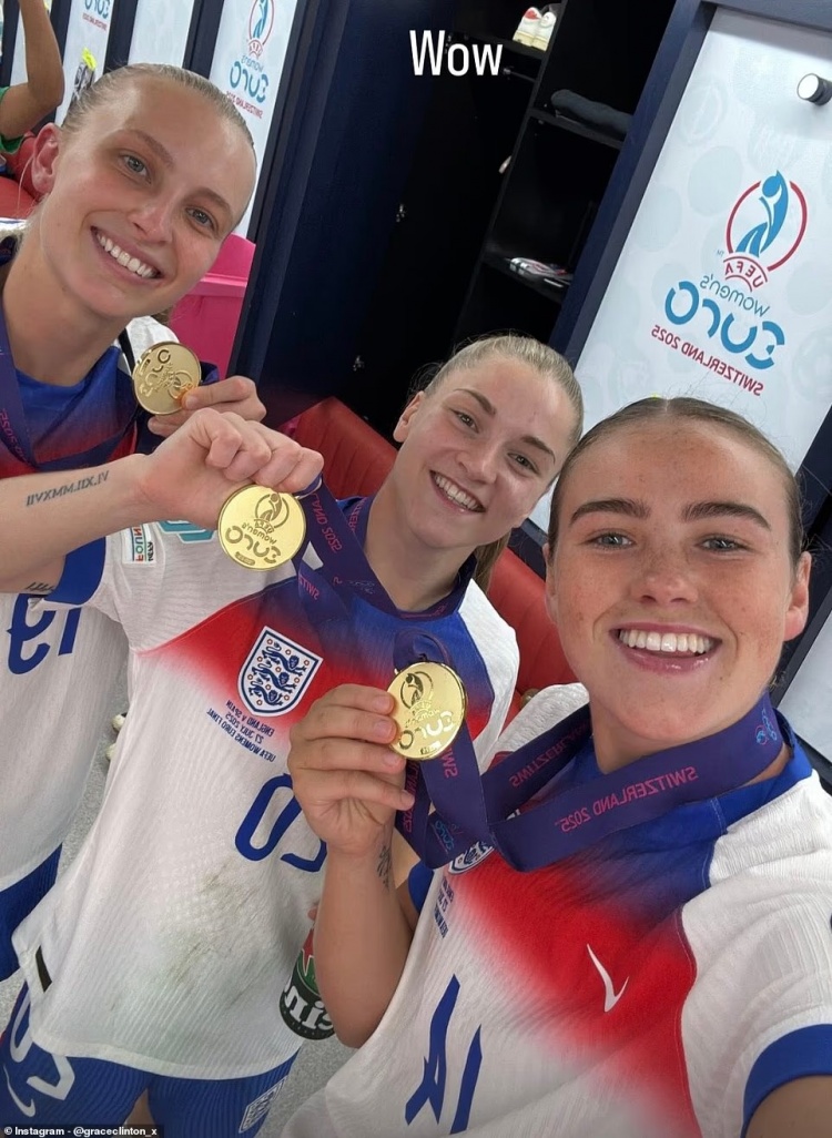 更衣室内,格蕾丝-克林顿、贝弗-琼斯和杰斯-帕克戴着奖牌玩自拍。切尔西球星贝弗-琼斯有独特事理庆祝,周日恰是她22岁生辰,她在INS发文:“史上最好生辰。”