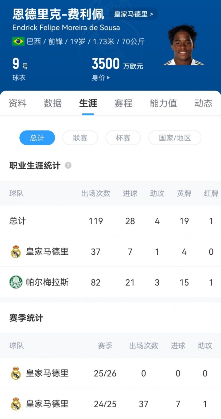 皇马在2024年夏天破耗4750万欧引进恩德里克,上赛季恩德里克出战37次觉得847分钟,孝敬7球1助攻。恩德里克的德回身价从最高时的6000万欧跌到了3500万欧。