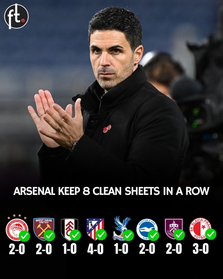 据数据统计,阿森纳追平了俱乐部在1903年创造的最长零封场次记录(8场)。