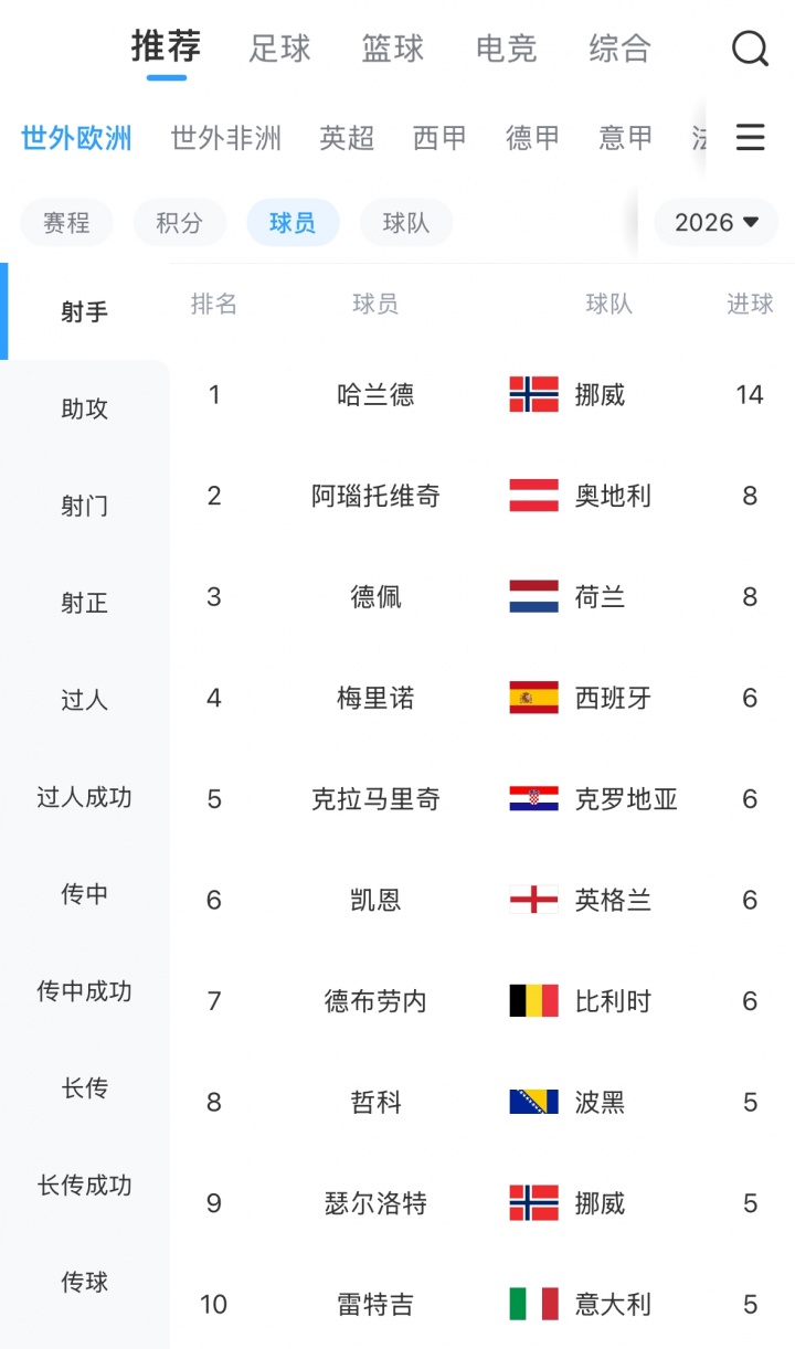 世初赛欧洲区现在的弓手榜,哈兰德14球断层领跑。他也基本细目拿下金靴。