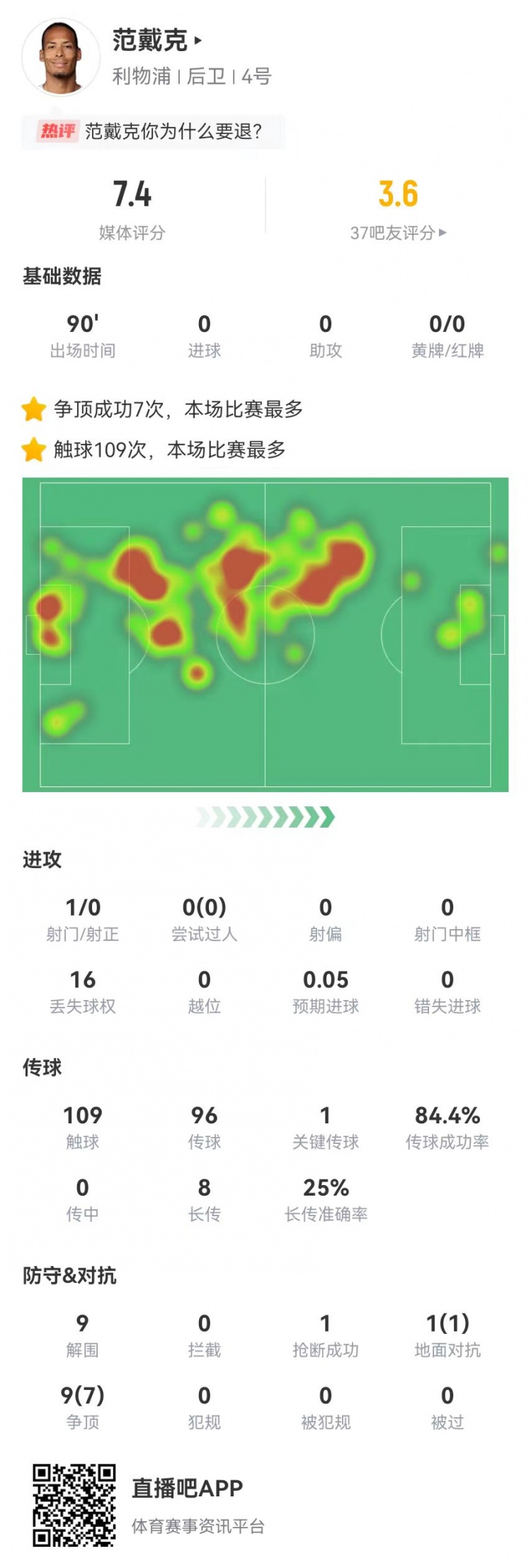 12月4日讯 利物浦在本轮英超1-1战平桑德兰,范戴克本场数据如下: