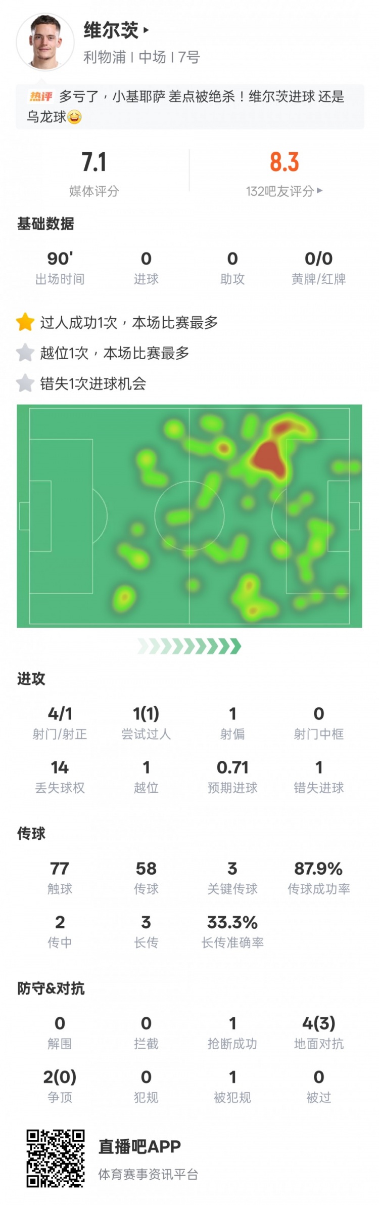 12月4日讯 2025-26赛季英超联赛第14轮,利物浦1-1桑德兰。维尔茨首发出战,形成敌手乌龙球,还送出3次要道传球,不外也错失1次进球契机,评分7.1。