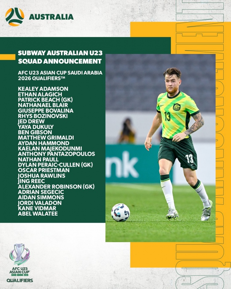 动作U22国足在新一届U23亚洲杯预选赛的头号竞争敌手,澳大利亚U22队今天公布了出征本阶段赛事的24东谈主球员名单。与中国U22队将适龄最优球员系数征调不同,澳大利亚U22队主要以进入球队此前两期集训的球员为主。