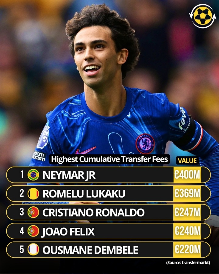 07月29日讯 当天利雅得告捷官宣签下菲利克斯,转会费总价5000万欧元,他的生存积累转会费来到历史第4,仅次于内马尔、卢卡库和C罗。