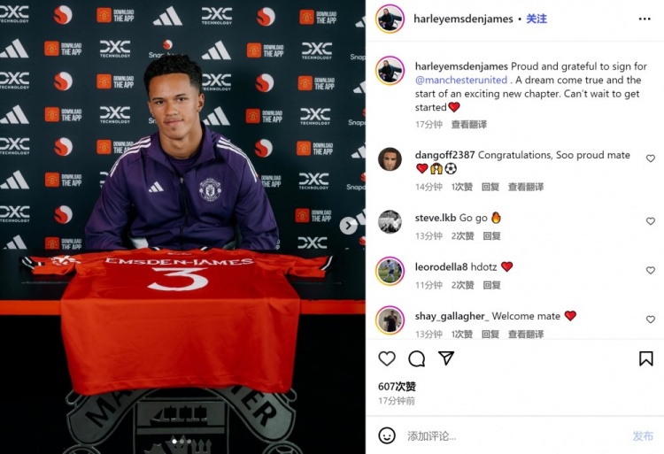 埃姆斯登-詹姆斯社媒晒出签约相片,文书我方从南安普顿加盟曼联,配文:“很雕悍和戴德八成与曼联签约,这是梦思成真,亦然欣慰东说念主心新篇章的开动,迫不足待思要开启新征途!”