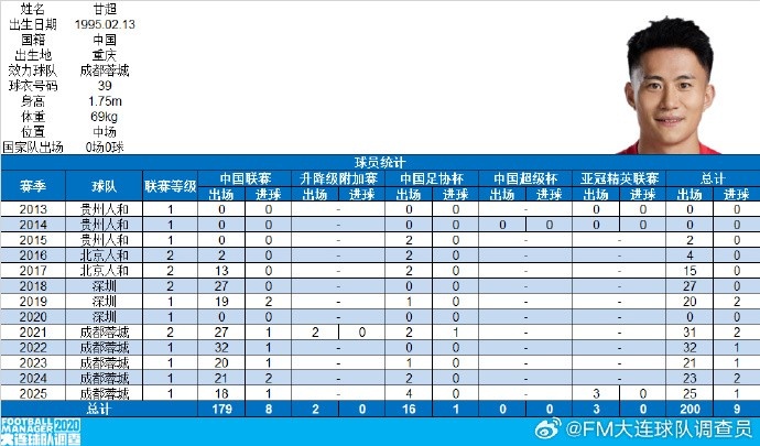 本场比赛,成齐蓉城中场甘超补时替补登场,竣事作事活命200场里程碑,其中在贵州东说念主和与北京东说念主和出场21次,在深圳队出场47次,在成齐蓉城出场132次。