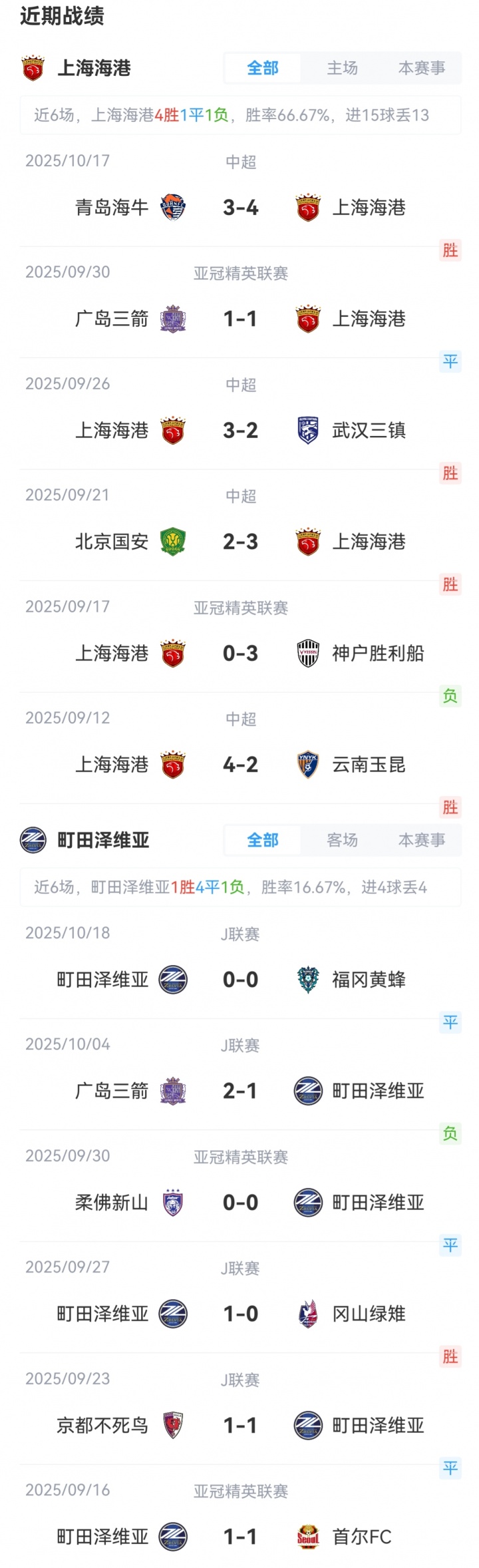 上海海港开局1平1负积1负,排行东亚区第11;町田泽维亚开局2平积2分,排行东亚区第8。
