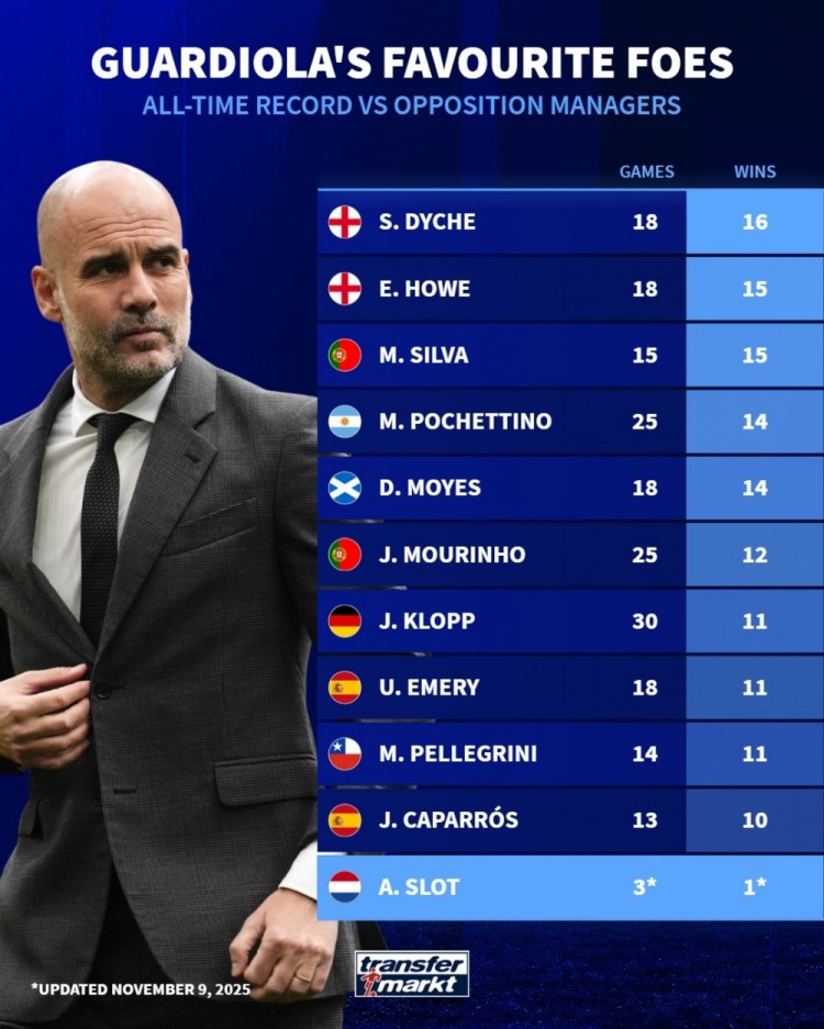 11月10日讯 曼城在本轮英超焦点战3-0完得胜物浦,瓜帅也赢得了抓教生存对阵斯洛特的首胜。《转会市集》也列出了瓜帅抓教生存对阵锻真金不怕火的胜场最多榜。