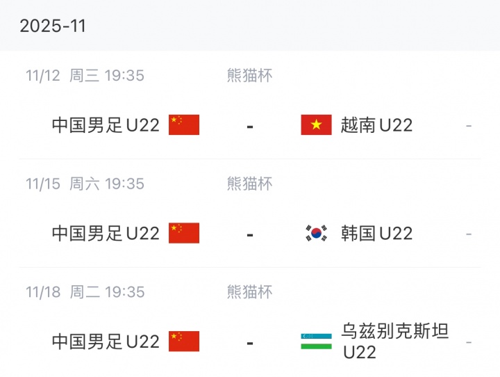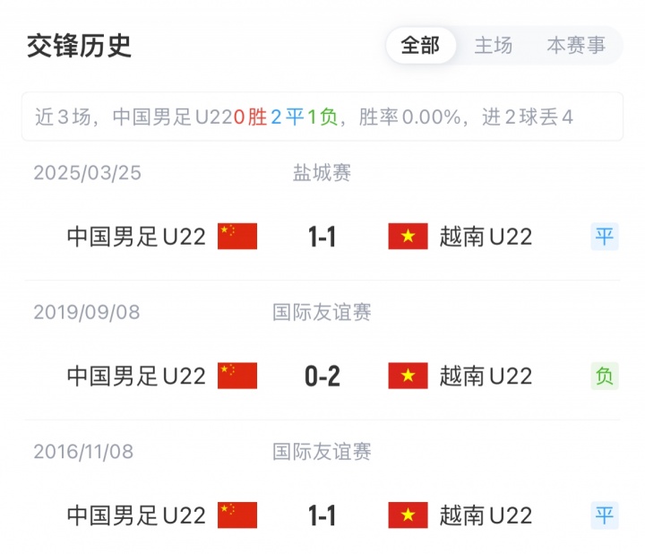两边近3次交锋,国足U22对阵越南2平1负未能取胜。本次熊猫杯国足U22将分散与越南U22、韩国U22、乌兹别克斯坦U22进行较量。