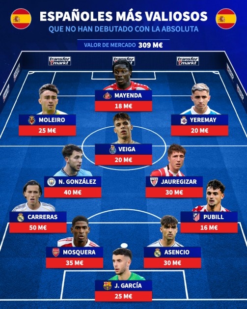 尚未代表西班牙队出场身价最高威望(总价3.09亿欧)