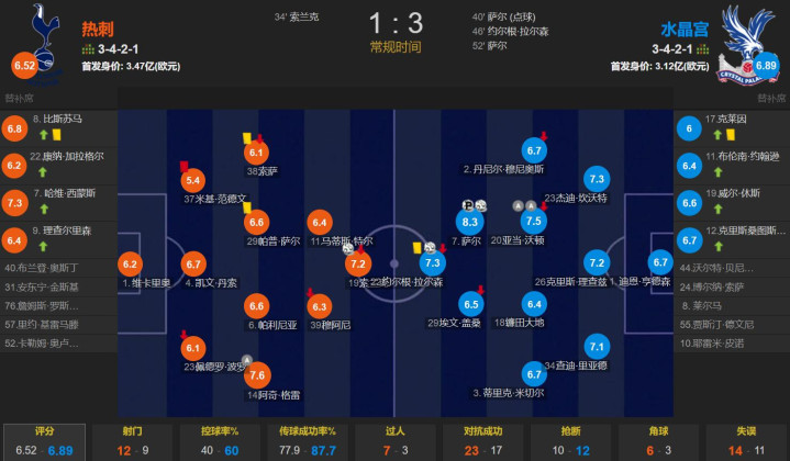 全场比赛,热刺的控球率为四成,一共有12次射门,比水晶宫的9次射门多了3次,但两队都是4次射正,水晶宫就打入3球,效率更高。