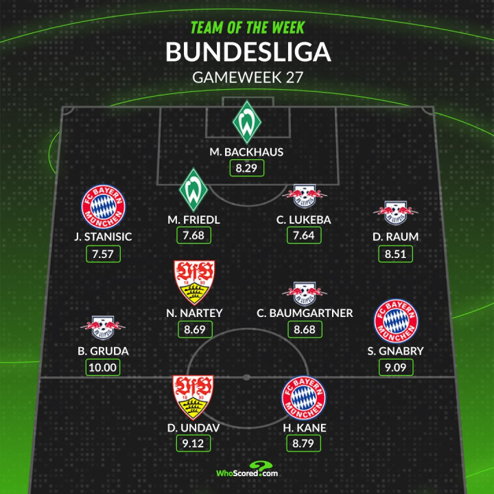 WhoScored本轮德甲最佳阵形 : 莱比锡4人入选, 拜仁3人在列