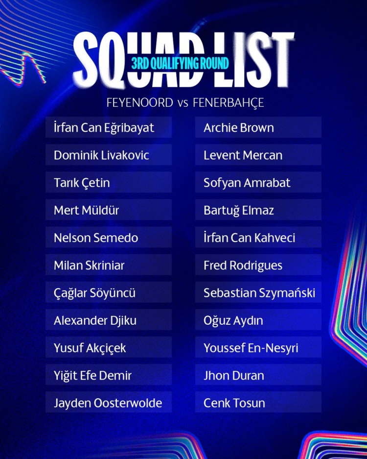 8月5日讯 费内巴切公布了欧冠经历赛第三轮对阵费耶诺德大名单,恩内斯里、弗雷德、阿姆拉巴特、什克在列,夏窗新援阿奇-布朗、塞梅多、杜兰入选。