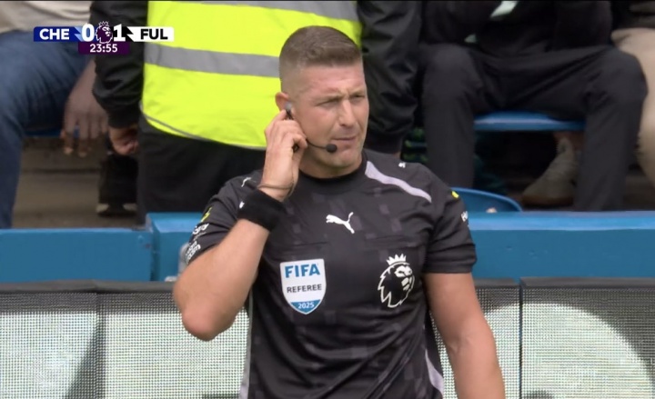 终末主裁判现场通知:"经核查,富勒姆30号球员在封堵传中时伸展双臂使身段不当然扩大。因此我的最终判罚是点球。"
