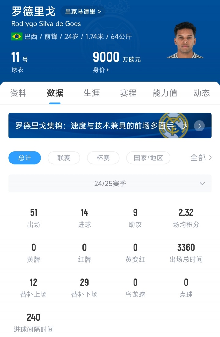 24岁的巴西时尚罗德里戈,上赛季代表皇马出战51场比赛,孝顺14粒进球和9次助攻,现在罗德里戈的德回身价为9000万欧元,他与皇马的公约将在2028年到期。