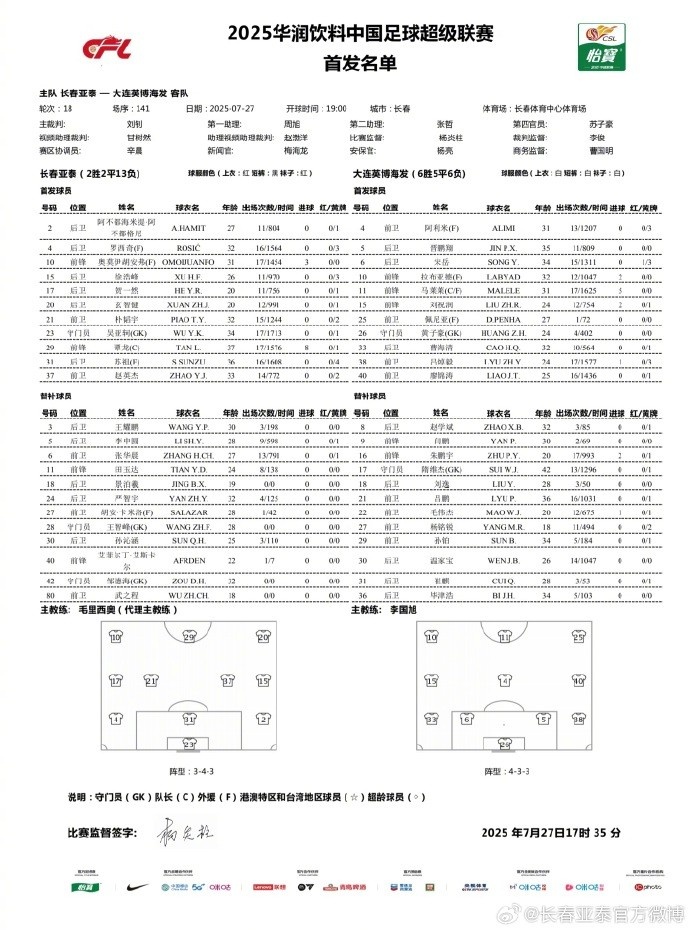 长春亚泰vs大连英博首发出炉,为长春咱们一齐搏斗