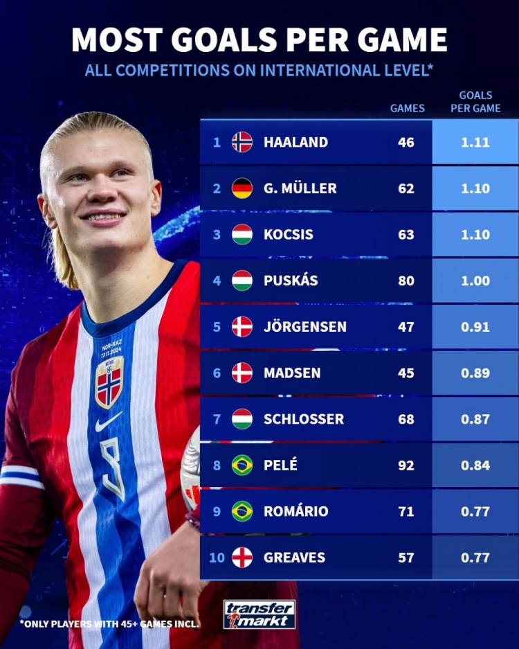 10月13日讯 德国转会市集统计了足坛历史球员在国度队的场均进球数目,比肩出榜单,哈兰德1.11球居首,盖德-穆勒、柯奇士次席。