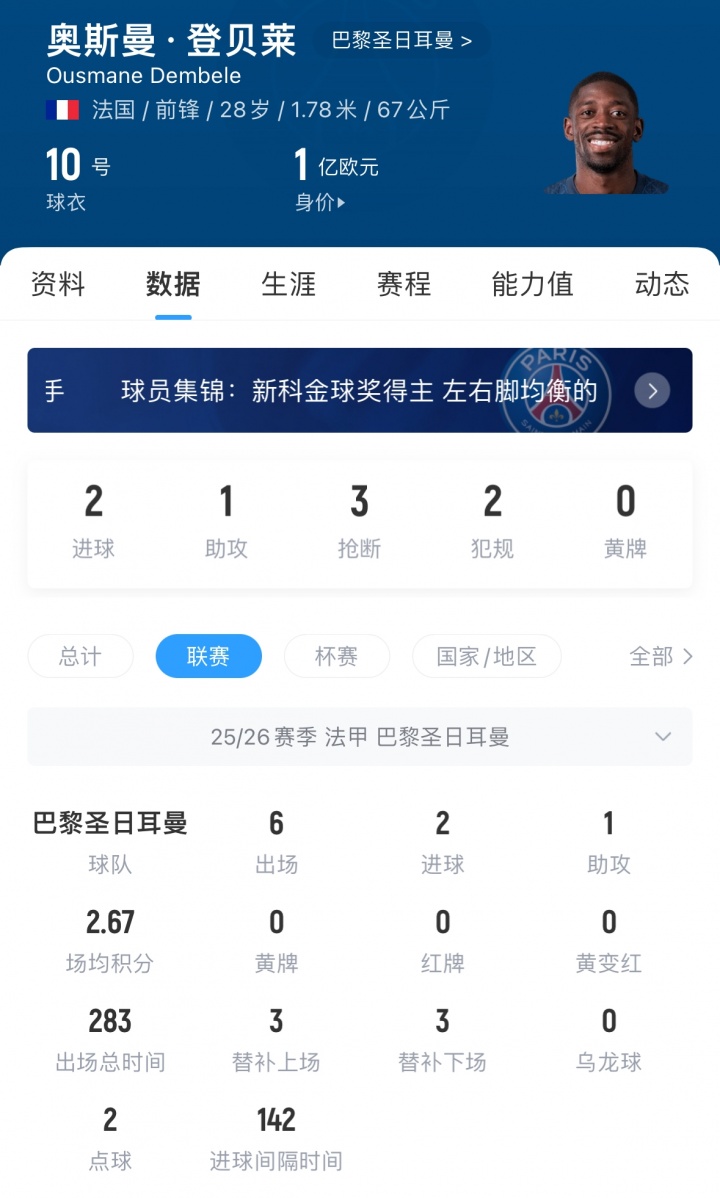 这是28岁的登贝莱本赛季第三次受伤,他本赛季仍是缺席了16场比赛中的7场,伤缺44天。他本赛季于今仅为巴黎出战6场法甲、2场欧冠和1场欧超杯,孝顺3球2助,计较425分钟,其中仅在欧超杯打满全场。