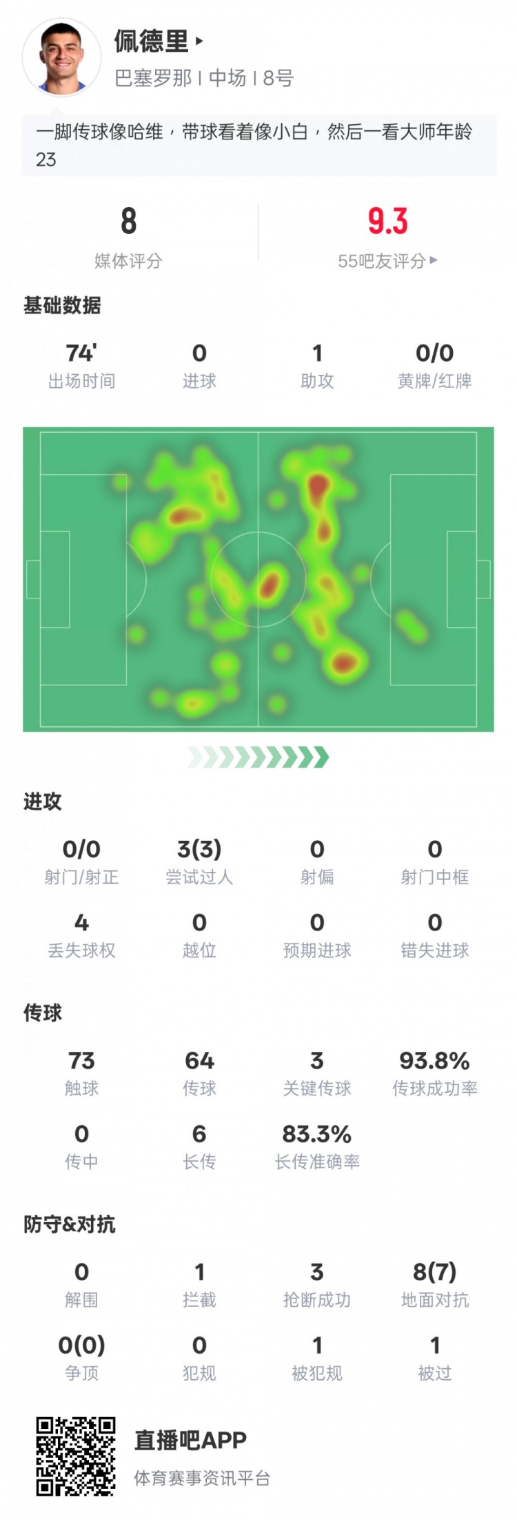 12月3日讯 2025-26赛季西甲联赛第19轮,巴萨主场迎战马竞。佩德里首发出战,送出1次助攻,3次要津传球,3次过东谈主均告捷,传球告捷率93.8%,评分8.0。