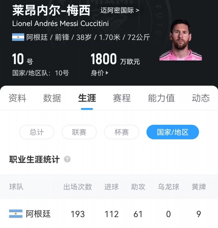 梅西在阿根廷的首秀有些不遂东谈主愿。登场不久后,他就吃到红牌被罚离场。但梅西最终成为了阿根廷队十足的听说和首领:他共为阿根廷队出场193次,孝敬112球61助攻,并带队得到了宇宙杯冠军、好意思洲杯冠军等多项分量级荣誉。
