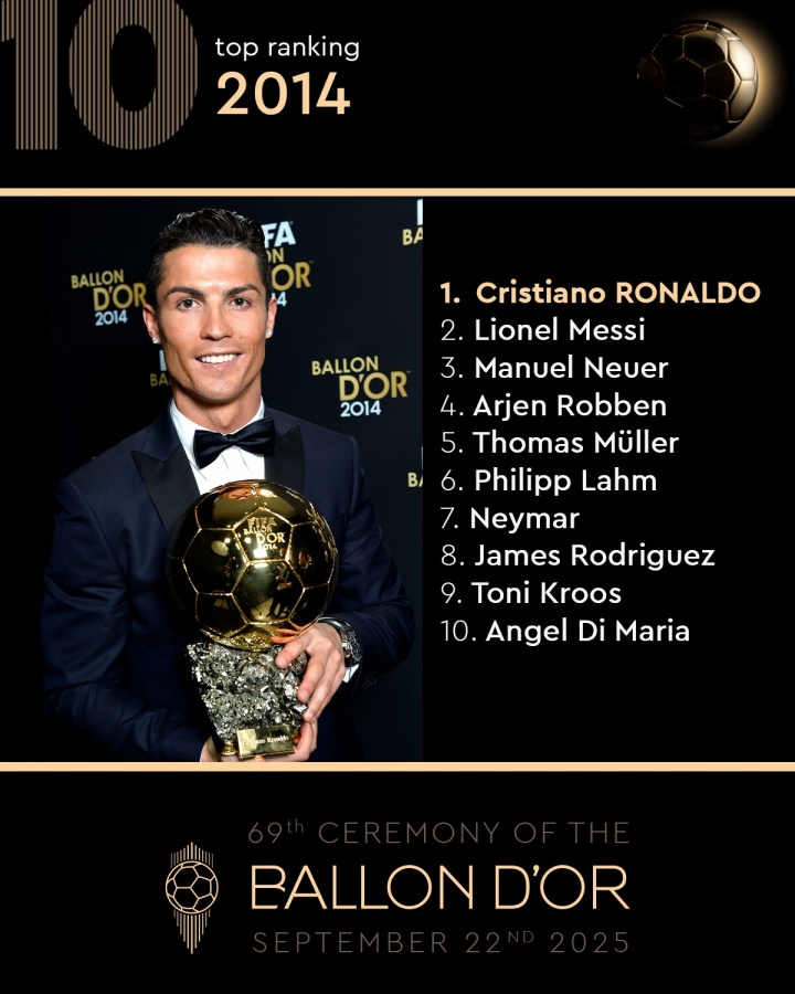 08月23日讯 金球奖官方连续每天一期盘货往届金球得主,预热一个月后的2025金球受奖仪式,今天来到了2014年。2014年C罗取得了我方生计的第3座金球奖,梅西、诺伊尔名次前三。