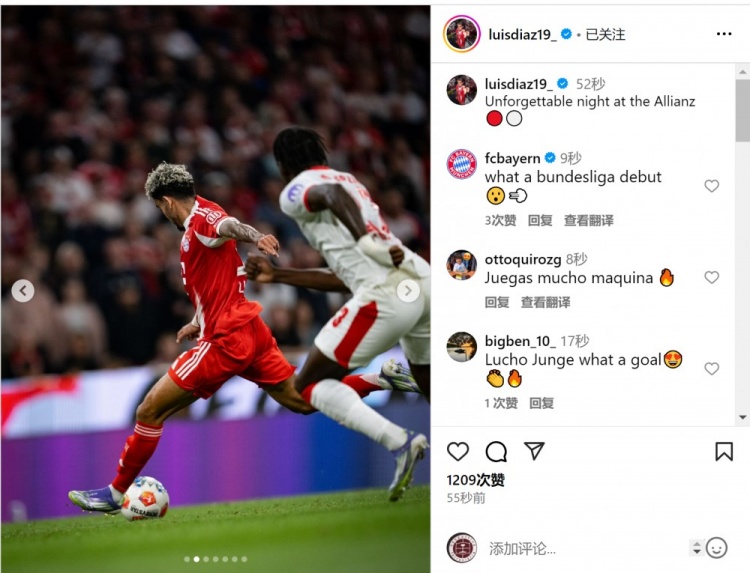 德甲首秀1射2传!迪亚斯社媒:安联球场的记起夜晚🔴⚪️