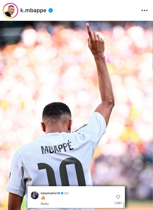 姆巴佩在外交媒体上晒出我方身穿10号皇马球衣的相片,莫德里奇随后在该条社媒下评述:🔥