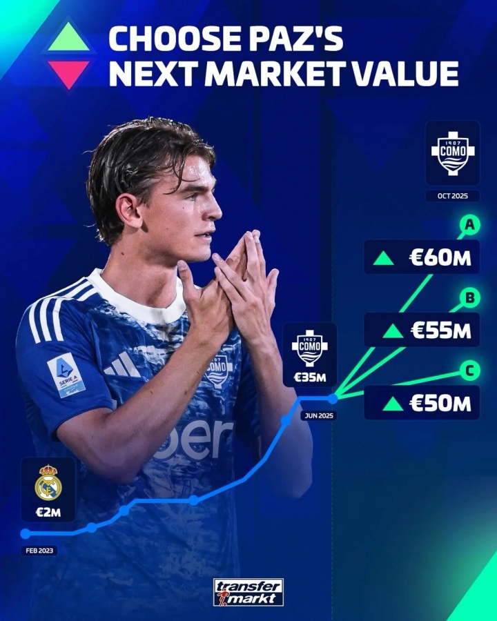 尼科-帕斯23年2月在皇马时身价仅为200万欧,本赛季尼科-帕斯为科莫出战6次,数据为3球3助,现身价3500万欧。