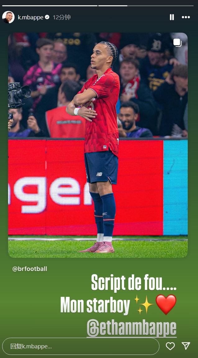 姆巴佩现场不雅看了这场比赛,见证弟弟绝平,他在外交媒体上晒出伊桑-姆巴佩的相片,配文:“跋扈的脚本,我的明星男孩。”