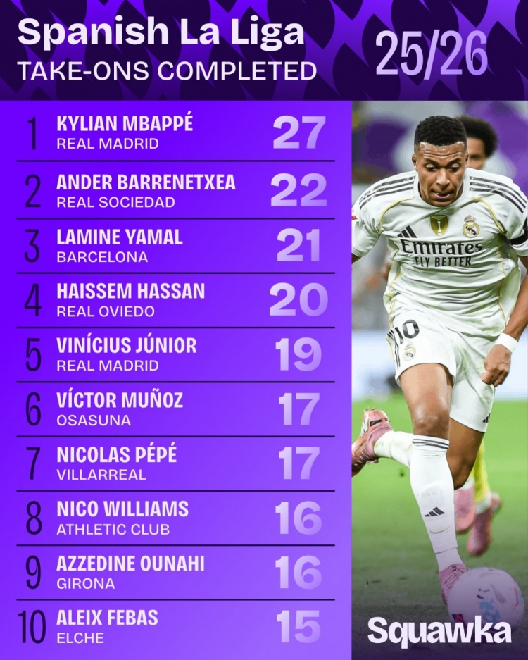 10月7日讯 日前,Squawka统计了本赛季西甲过东说念主次数名次,姆巴佩以27次过东说念主居首。
