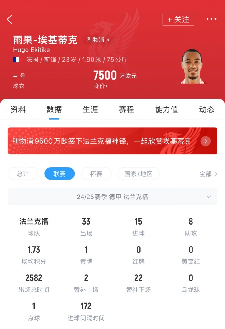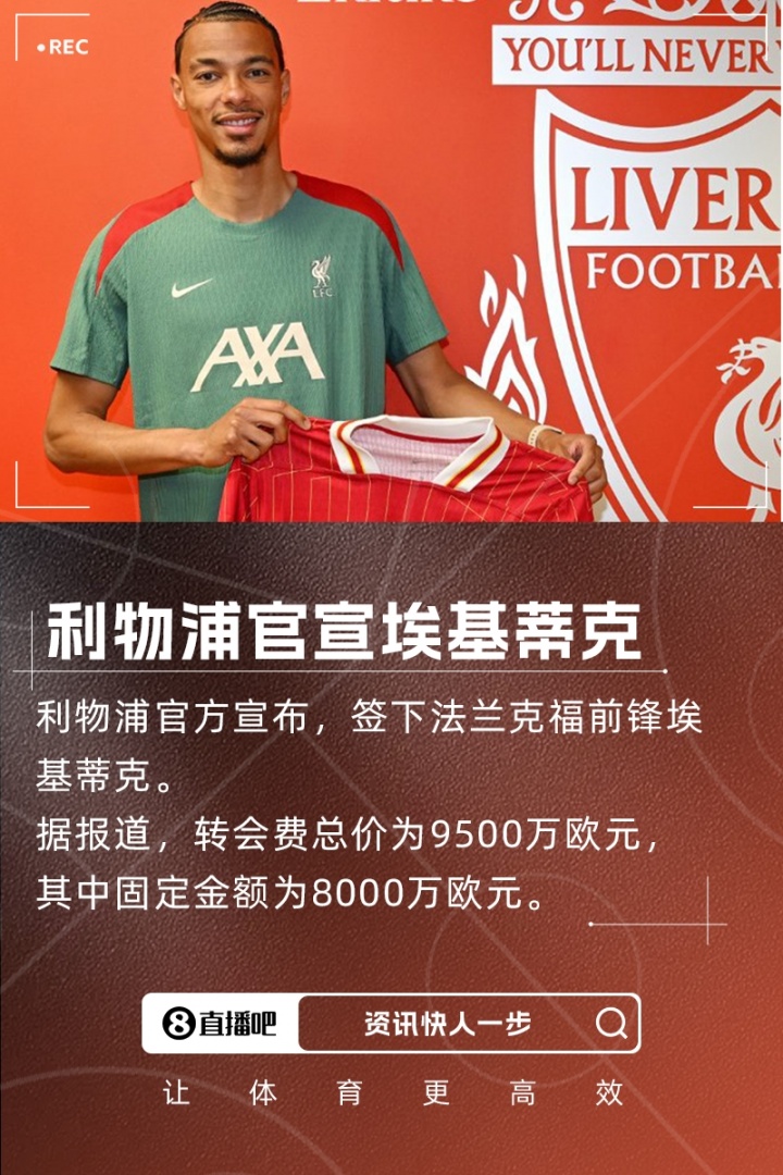 7月24日讯 官方音讯,利物浦签下23岁先锋埃基蒂克。据此前罗马诺报谈,转会费总价为9500万欧元,具体结构为8000万固定+1000万浮动,另有500万难以达到的条目。