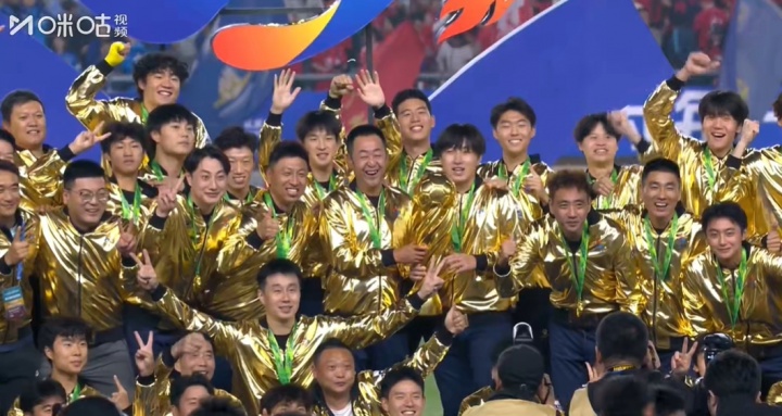 赛后授奖循序,泰州队全队身着金色战袍,捧最先届苏超冠军奖杯!