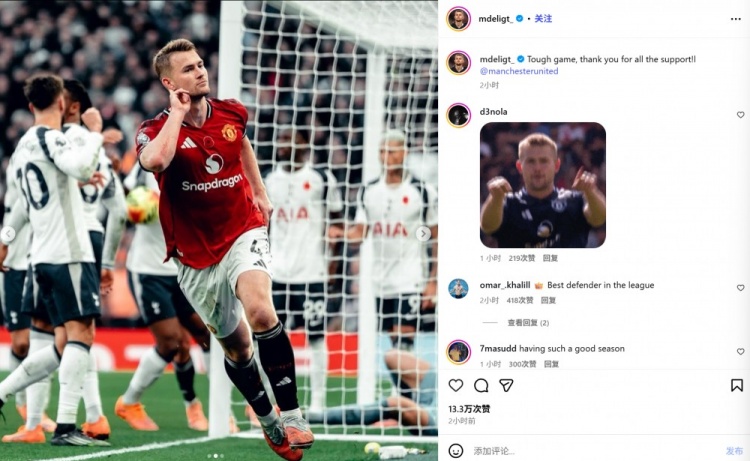 11月9日讯 曼联在本轮英超焦点战2-2绝平热刺,德里赫特头槌破门。