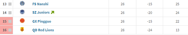 25轮之后,广西平果、青岛红狮差异以21分、12分名次倒数后两位。其中,广西平果比名轮换13位、第14位的佛山南狮、深圳后生东谈主差异少了4分、2分。